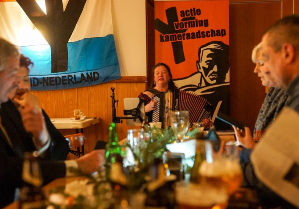 De avond was nog niet voorbij want er stond een zangstonde op het programma. Aloude strijdliederen als ‘de zilvervloot’ en ‘merck toch hoe sterck’ werden uit volle borst meegezongen onder muzikale begeleiding van een trekzak.